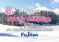 スプリングキャンペーン。リフト1基2コース、スノーパーク、ちびっこ愛ランド、展望リフトOPEN。