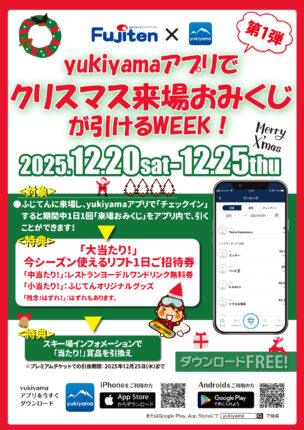 12/20(土)~25(木)まで、1日1回ふじてんでおみくじが引けるイベント!「クリスマス!来場おみくじWEEK」を開催します!yukiyamaアプリをダウンロードして現地でチェックインすると誰でも参加できる企画です!